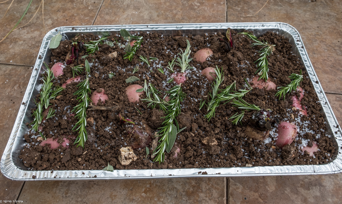 תפוחי אדמה וסלקים טמונים באדמה ואפויים 'על המנגל'.