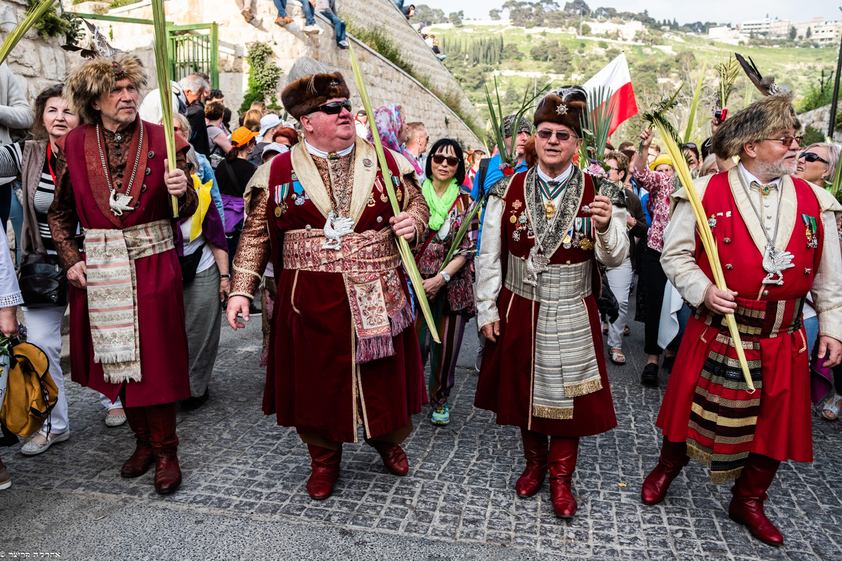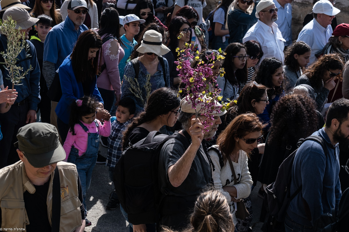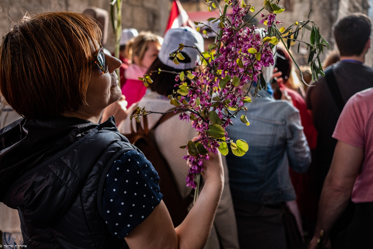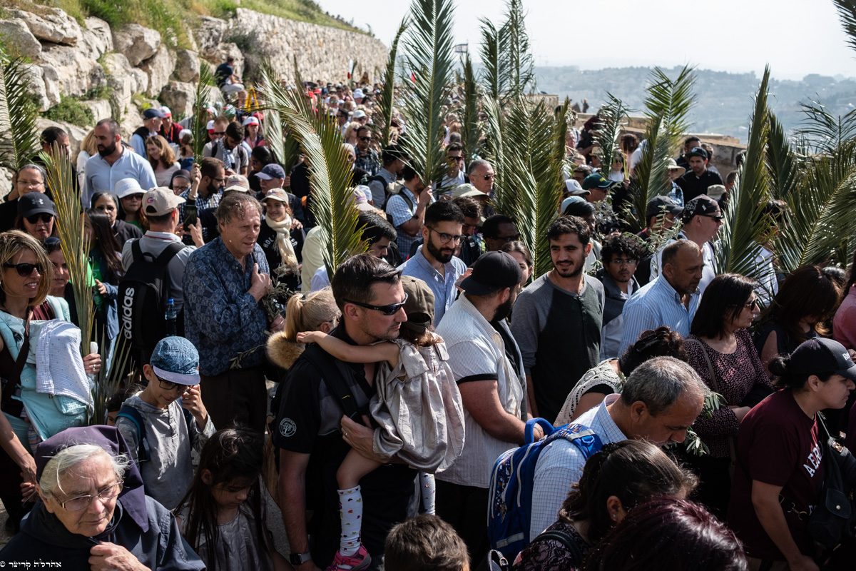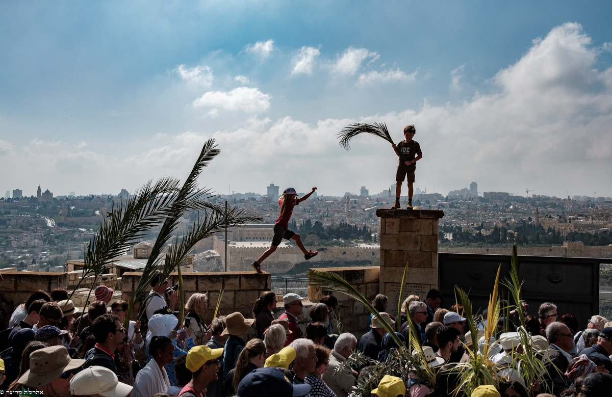 הצועדים נושאים בידיהם כפות תמרים וענפי עץ זית והתזכורות היהודיות לתקופת העלייה לרגל ברגלים לבית המקדש הם מרגשות, בעבורי.